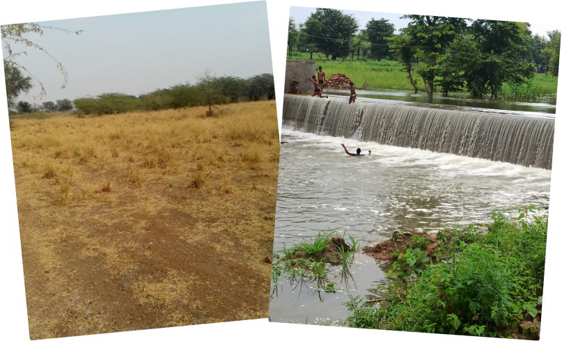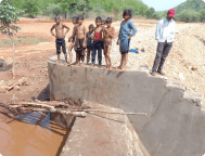 A check dam is a strategically built small permanent structure, which acts as an obstacle for rainwater gushing down the hillside thereby creating a reservoir. However, our structures are much larger with some of them holding as much as 12 crore litres of rain water in a good monsoon. The structures consist of a relatively small masonry headwall which acts as a spill weir to remove excess water from the dam and extensive earthen embankments flanking the headwall on both sides enabling them to hold huge quantities of water. The overflow of rainwater becomes a streamlet emerging from an erstwhile barren village which continues to flow for several months finally pouring it's bounty in the revenue map rivers of the vicinity. These structures raise the groundwater table, recharge hundreds of wells and bore wells and even create rivulets, effectively protecting villages from both droughts and floods.